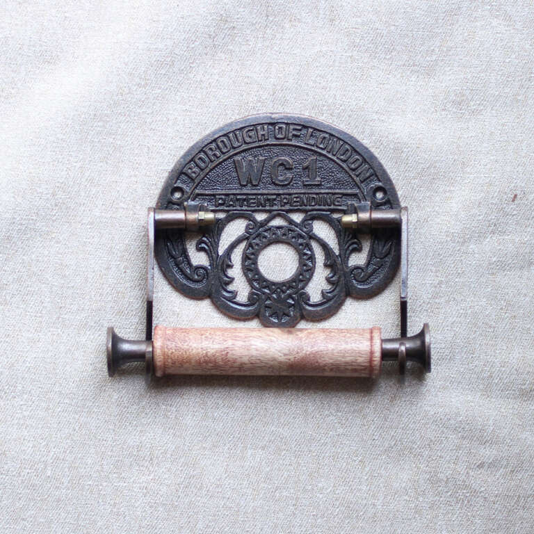 Copper-colored toilet paper holder. This one is full of intricate details with the inscription borough of London on top and WC1 in big letters. It is made of cast iron, so solid and dependable. The width between the two arms is 5 inches. It is easy to install with two holes for screwing in screws that are included when you order this item. Free shipping is available.