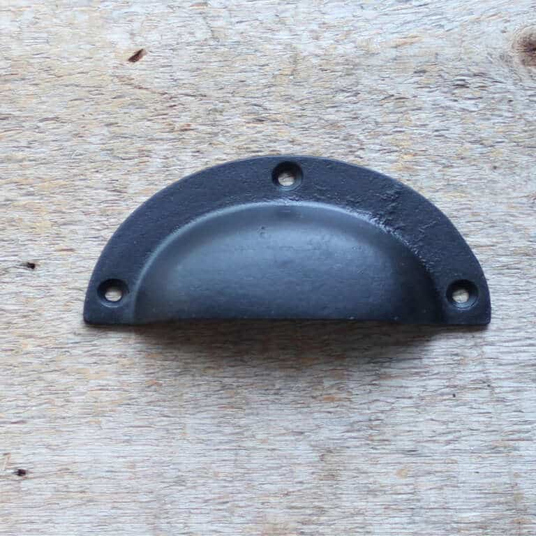 Very solid and sturdy cast iron pull cup. The design is part Art Deco with its circular line and classic in its simplicity. This one goes well with a kitchen drawer or an office desk drawer. That is what happens when a design is timeless. Screws are included and free shipping is available.