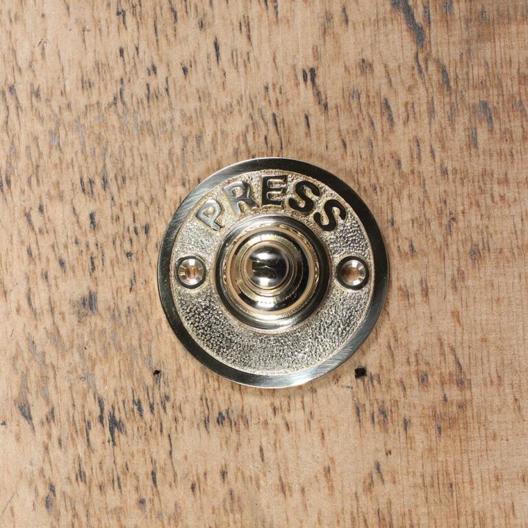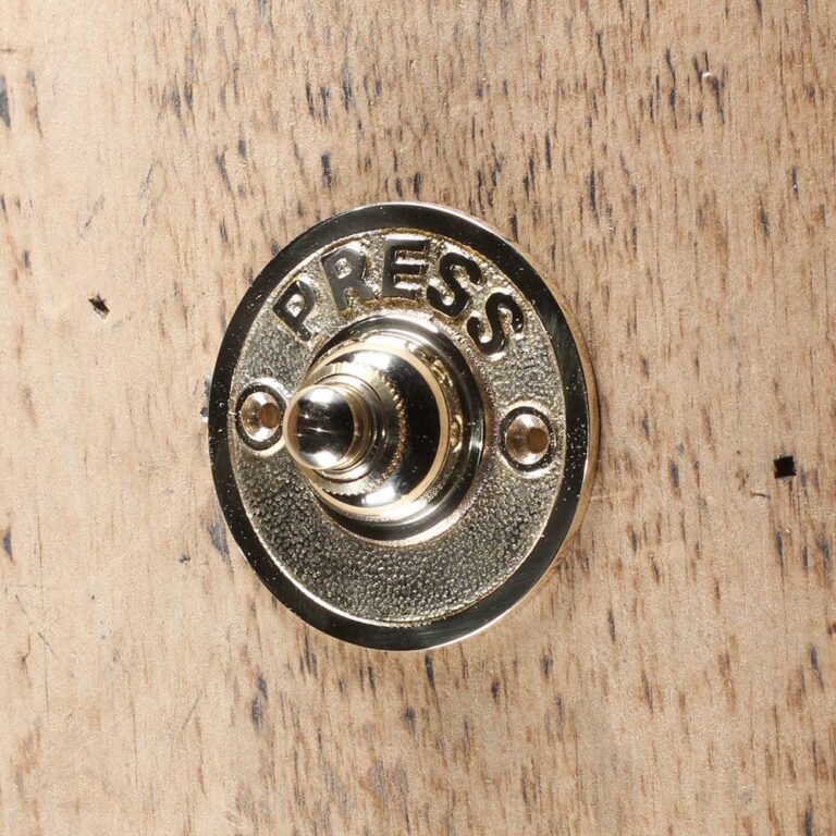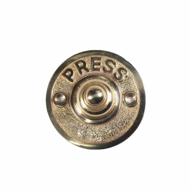 This solid brass doorbell with "press" inlaid is cast brass and is art deco in its architectural style. This doorbell is available in three finishes: chrome, brass, and antique copper. This is a replica of a doorbell style over a century old.