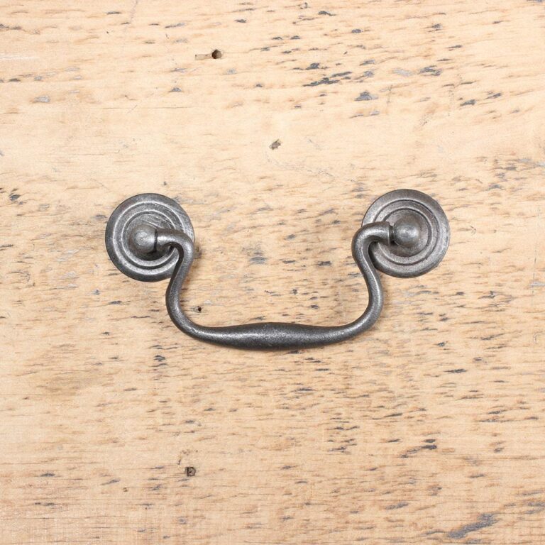 The Classic cast iron 5-inch Drawer Drop Handle with two round backplates in an antique iron finish is an elegant and timeless hardware piece designed to add a touch of sophistication to any furniture or cabinetry.