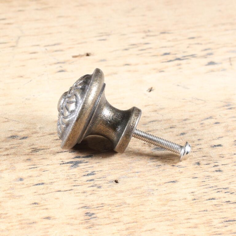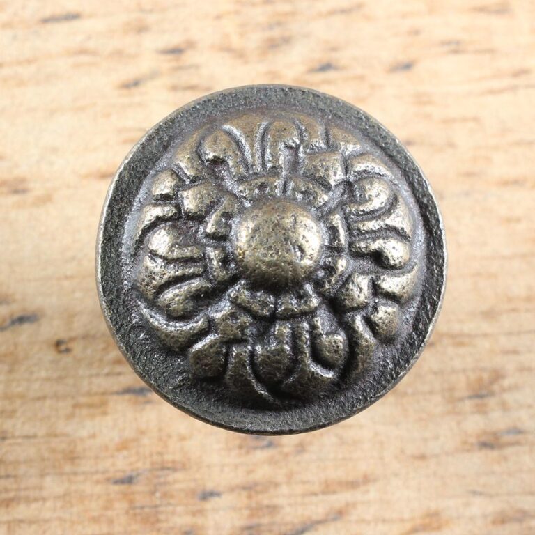 Cast iron knob with lily design and an old brass-colored finish. Free shipping is available.