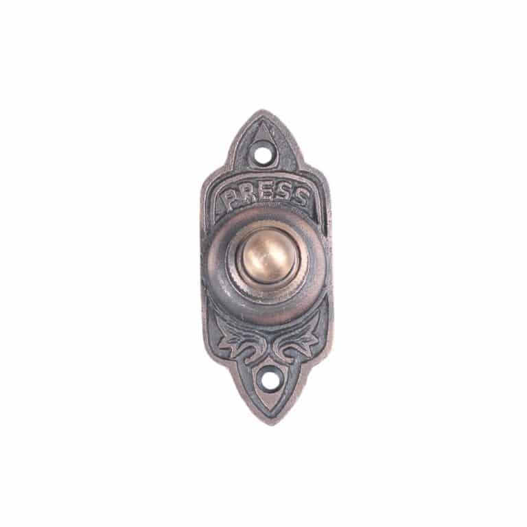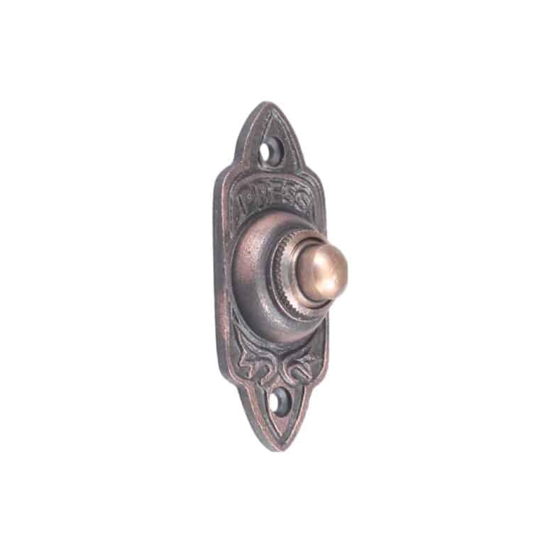 This reliable push-button old copper finish doorbell will look great at your entrance. An elegant focal point for your entryway, this old copper-colored Door Bell Button made of cast brass, exudes timeless charm. Its rich, warm hue complements any traditional or vintage aesthetic, while the intricate detailing adds a touch of sophistication, the art deco influence is there. With a satisfyingly solid feel, this button invites guests to announce their arrival in style.