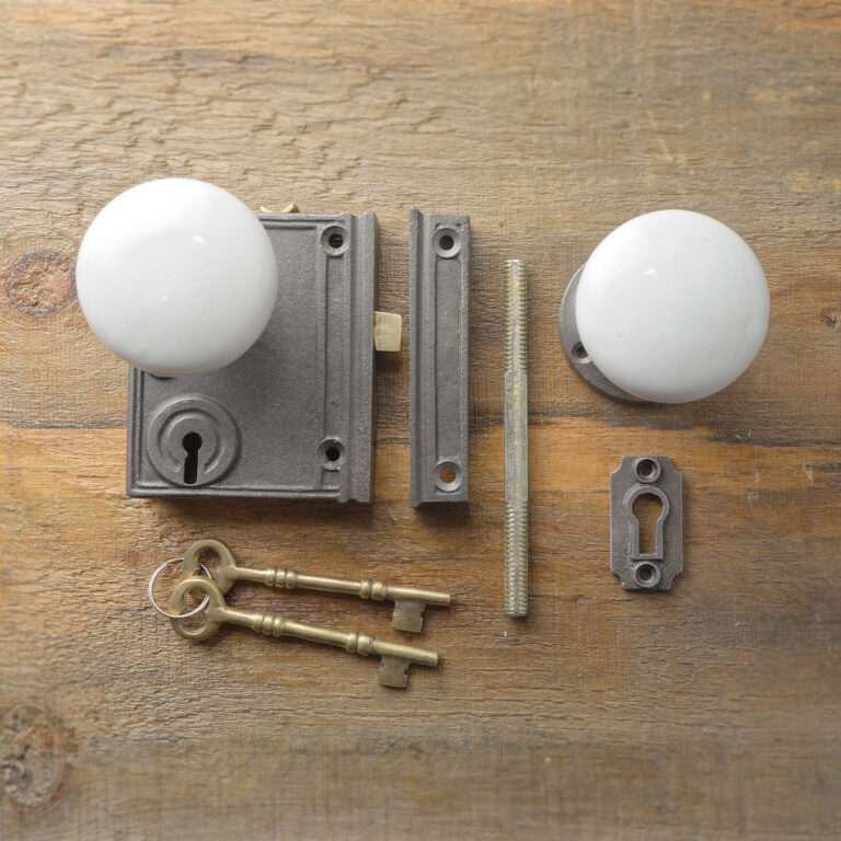 Vertigal classic cast iron rim lock. This rim lock is built to last. It is a great addition for your restoration door project. This set comes with white porcelain knobs. You can replace them for black, brown, or white vintage porcelain knobs. Please specifiy in your order which ones you want. Screws are included and free shipping is available.