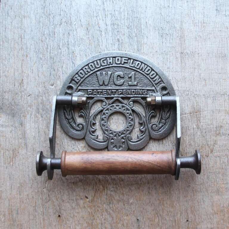 Antique iron colored toilet paper holder. This one is full of intricate details with the inscription borough of London on top and WC1 in big letters. It is made of cast iron, so solid and dependable. The width between the two arms is 5 inches. It is easy to install with two holes for screwing in screws that are included when you order this item. Free shipping is available.