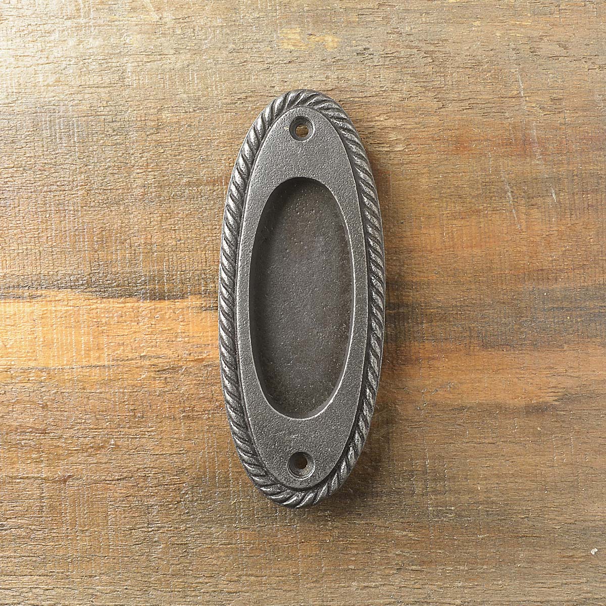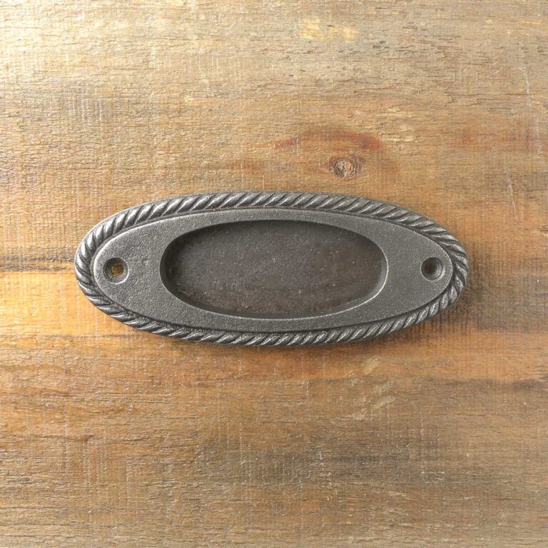 Poignée encastrée ovale en fonte facilement nettoyable et durable. Avec son fini fer antique et son contour au motif de corde, elle ajoutera du style portes escamotables ou de garde-robes. Rabais à la quantité à partir de 10 poignées.