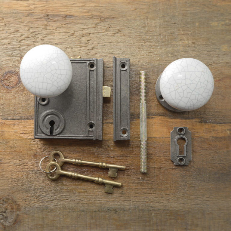 Serrure vertical en fonte avec poignée en porcelaine blanche craquelée
